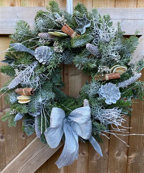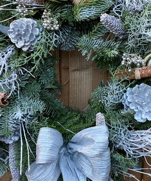 Luxury Christmas pine ring decorated with white decorations. Featuring a luxury silver ribbon bow and decorations including silver sticks, cinnamon, Lime slices and silver cones
