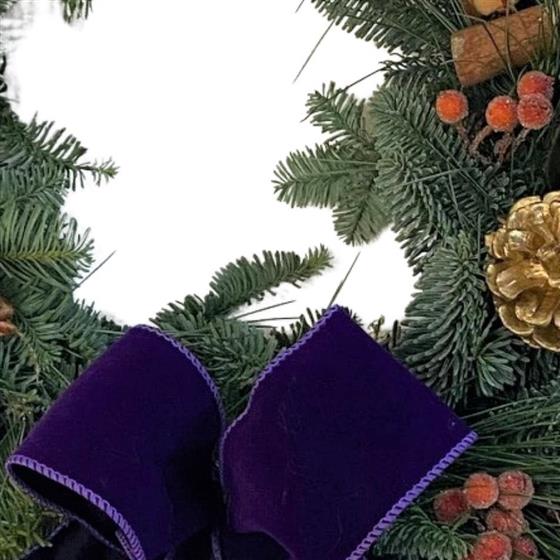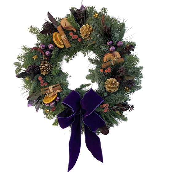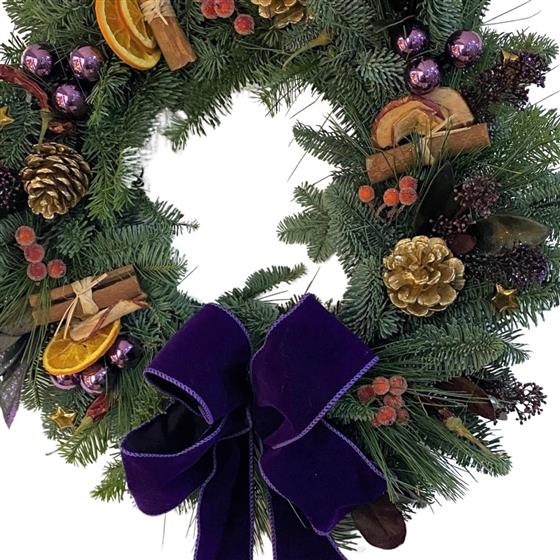 Luxury Christmas pine ring decorated with Purple and Gold decorations.