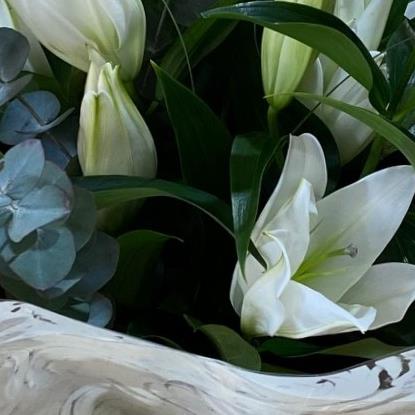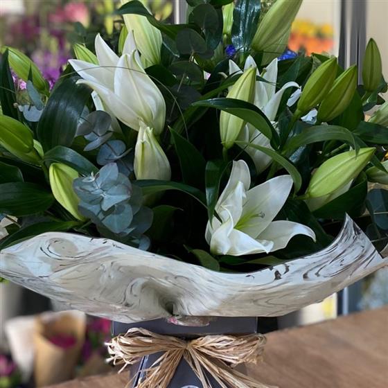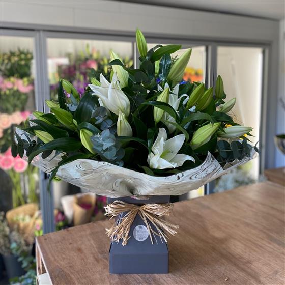 Simplicity is the key to this magnificent white Lily Bouquet as we let these scented white lilies be the hero flower. We add just a touch of mixed foliage's to the design.
