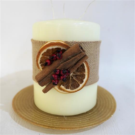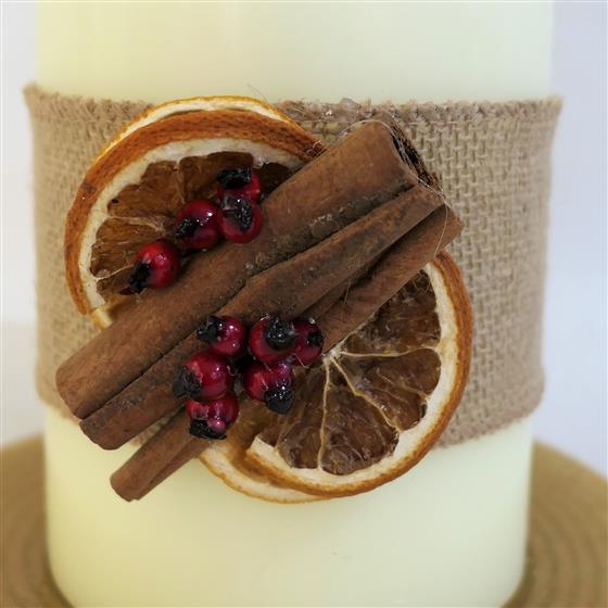 A long burning 3 wick chapel candle decorated with Hessian, orange slices, cinnamon and berries, presented on a gold glass glitter plate.