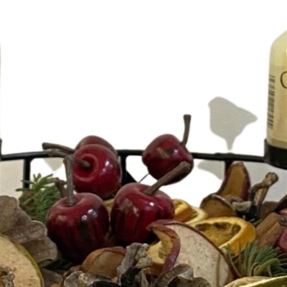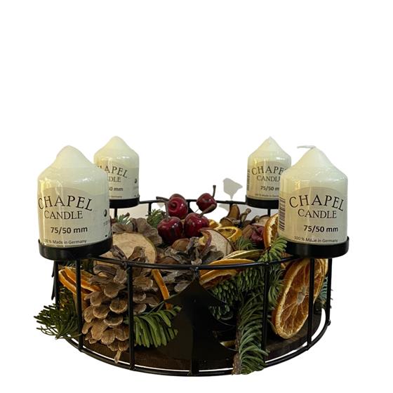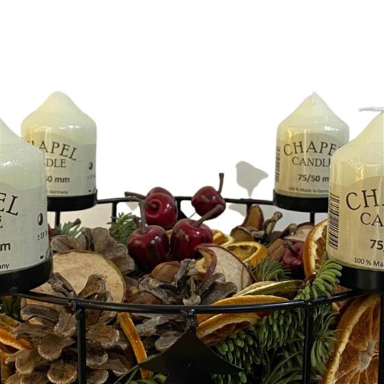Unique black iron candle design with 4 chapel candles, dried fruits, cones and pine.