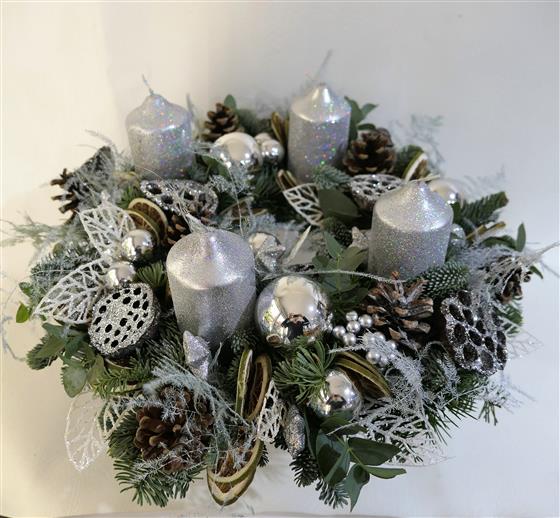Luxury Advent wreath- 12". Made with of fresh blue spruce pine and 4 silver glittered candles. Decorated with a delicious selection of natural and silver decorations, including pine cone, lotus heads, lemon slices and white asparagus fern.