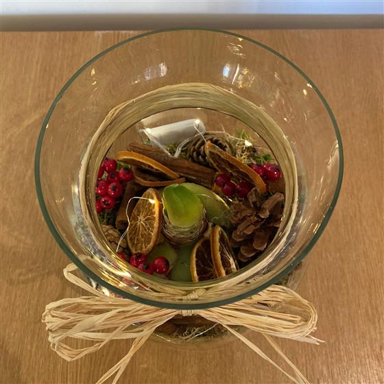 A large Amaryllis displayed in a glass vase filled with moss, cones, cinnamon, orange slices, berries and pretty Christmas lights. The perfect gift or addition to any home.