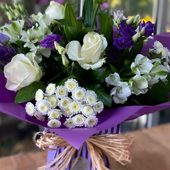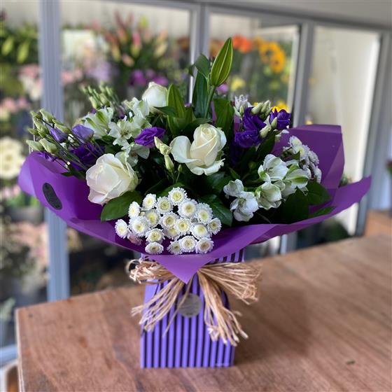 Mauves and ivory are the star combination in this aqua pack hand-tied. Roses and lilies take the lead with added colour of purple Lisianthus.
