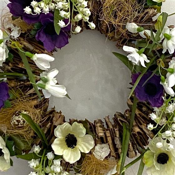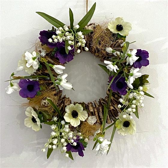 Beautiful artificial flowers on a bark ring. A Lovely long lasting wreath for your door or table decoration