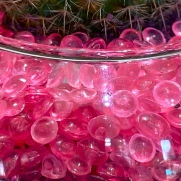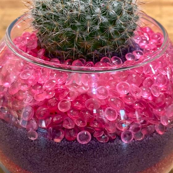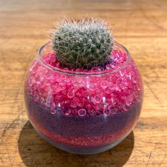 Cactus in glass with pink and purple sands and grits