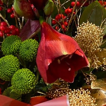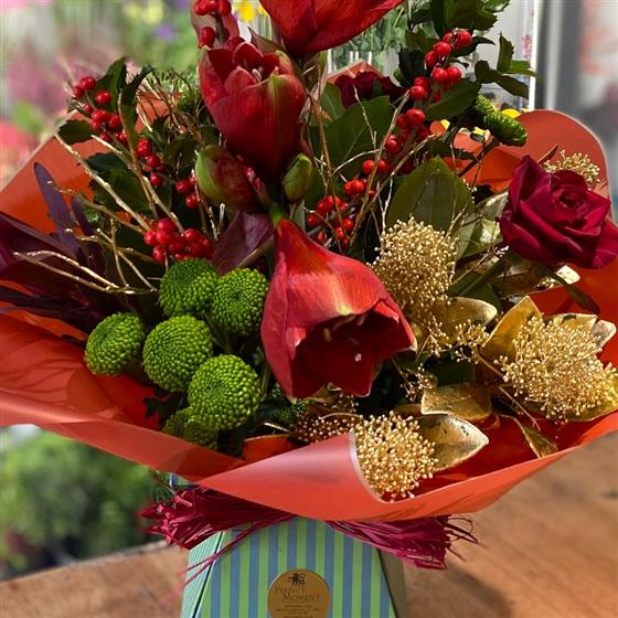A Stunning Christmas design, featuring red Amaryllis, roses and gold foliage's. This floral bunch is beautifully arranged in it's own box of water for an instant gift.
