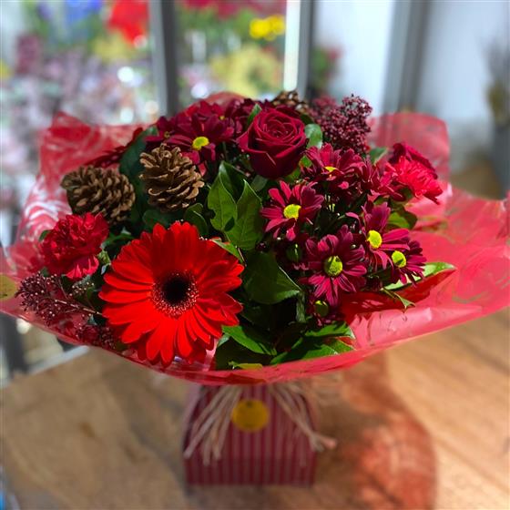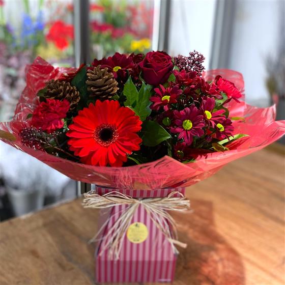 A beautiful Christmas selection of seasonal red flowers and winter foliage's and scented cinnamon cones. This floral bunch is beautifully arranged in it's own box of water for an instant gift.
