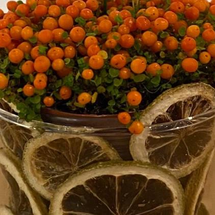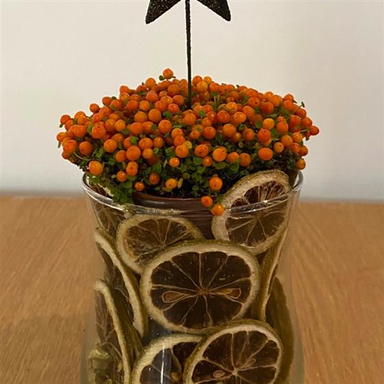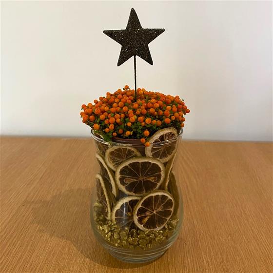 A seasonal Nertia plant filled with tiny orange berries- displayed in a clear glass vase on a bed of gold grit - decorated with dried lime slices and a glittered star.