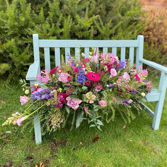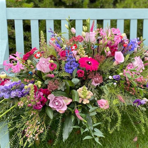 Coffin spray design using seasonal pink, lilac and purple flowers and mixed loose greenery