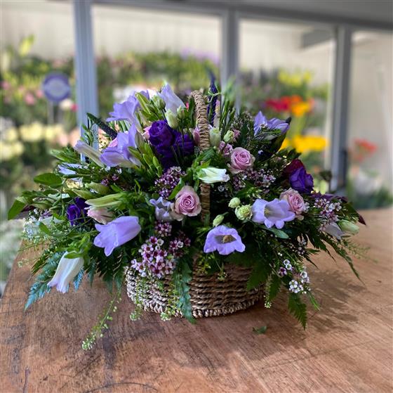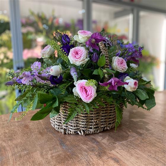 An English country garden style flower basket. A pretty mix of delicate pink and lilac flowers.