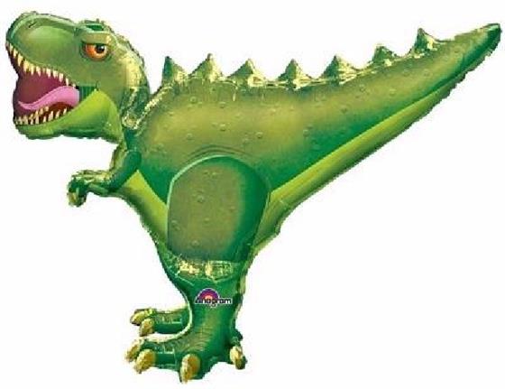 Large dinosaur balloon. filled with helium and decorated with ribbon on a heavy balloon weight.