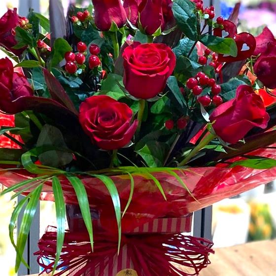 12 Velvety red Freedom roses with sumptuous red Hypericum berry, dramatic red Dracaena leaves and finished with exotic palm leaves packed in a floral box.