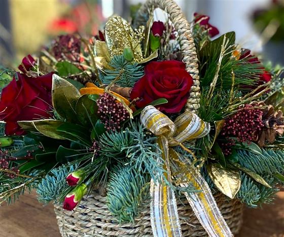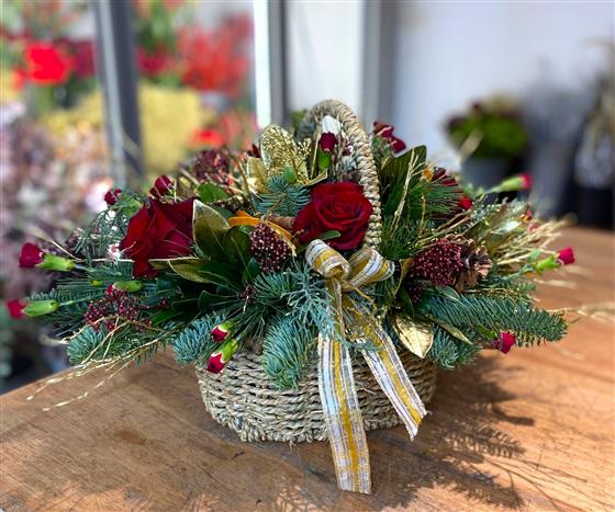 A gorgeous ruby red Christmas flower Basket bursting with a wonderful selection of seasonal flowers and winter foliage's. This gift is perfect for someone who may not have the skill or time to arrange their own flowers this Christmas. It looks great placed on a kitchen table or Coffee table.