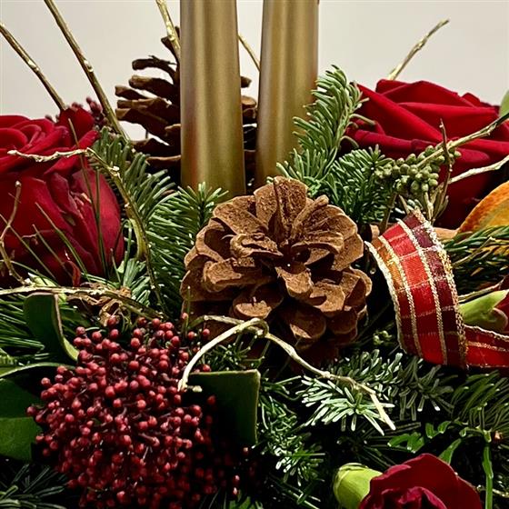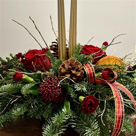 A truly timeless classic candle arrangement. We place two tapered candles in the centre and create a beautiful flower arrangement of fresh flowers, dried fruits and winter foliage's. This design is an exquisite, seasonal centre piece for a table at Christmas.