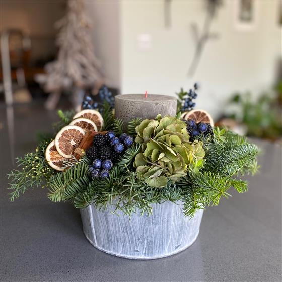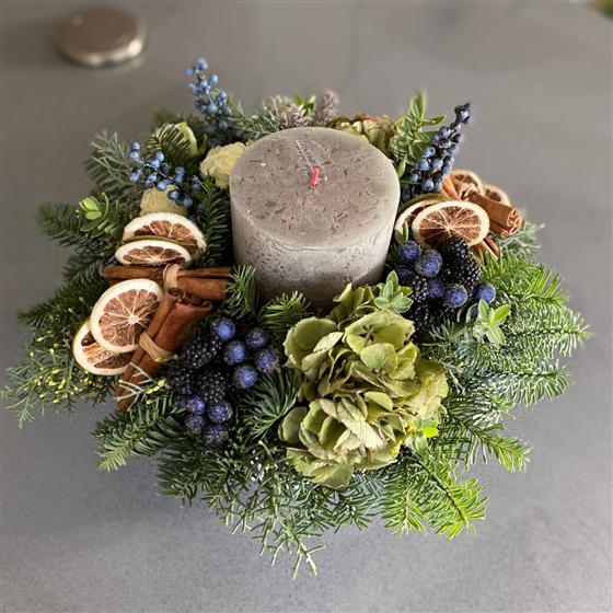 A luxury fresh pine table design in greens and blue with rustic Bolsius candle. Long lasting. Perfect for Christmas and New year!