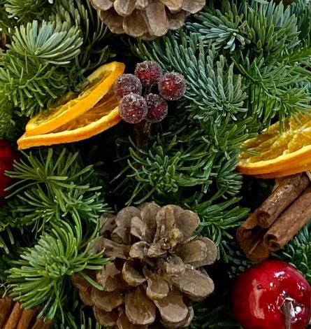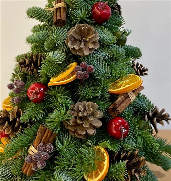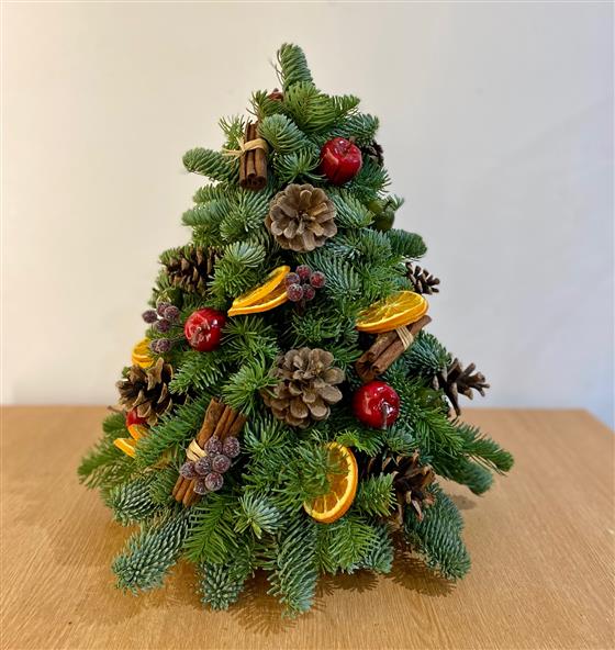 A cute hand made Christmas tree made with real pine and decorated with cones, cinnamon bundles, apples and orange slices. Finished off with a set of pretty lights.