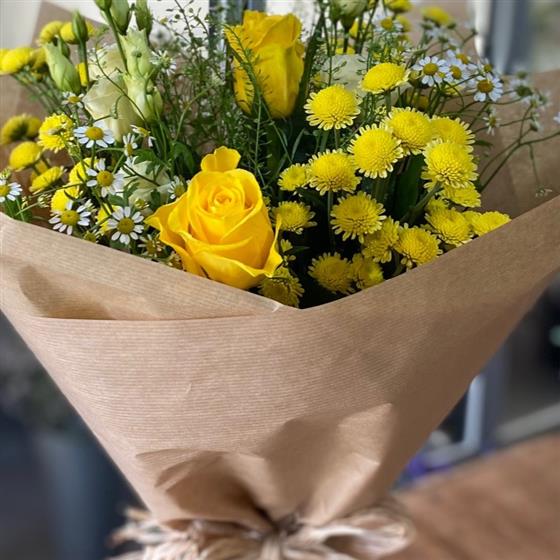 A selection of yellow and white flowers wrapped in Eco friendly craft paper.