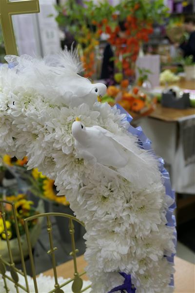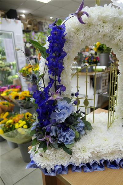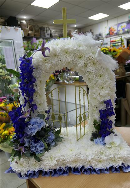 White Chrysanthemum based 'Gates of Heaven' design with Delphinium, Hydrangea, exotic Orchids and complimentary foliage. With a pair of white Doves.