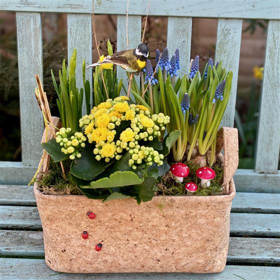 Bright, cheerful, and full of seasonal charm, the Golden Spring Song Planter celebrates the arrival of spring with vibrant color and playful garden details. Arranged in a natural cork-style rectangular planter, this lively display features brilliant yellow Kalanchoe blooms surrounded by fresh greenery and clusters of blue grape hyacinths (Muscari) that add height and contrast.
