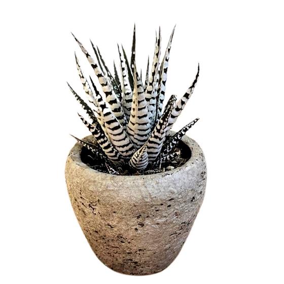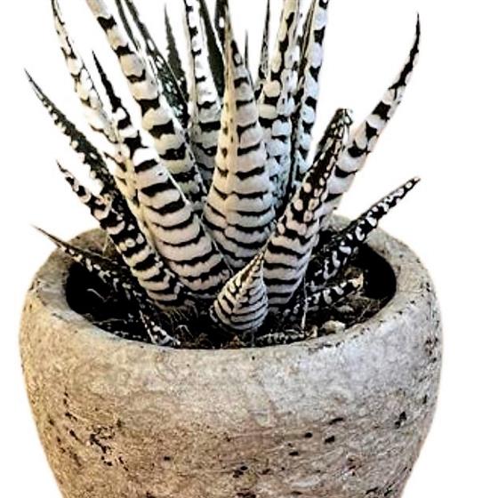 This succulent is great for your indoor succulent garden. It has thick, dark green leaves with white horizontal stripes on the outside of the leaves. The inside of the leaves are smooth.