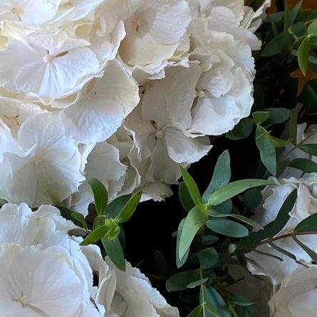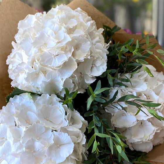 A simple tied design of elegant white Hydrangeas and Eucalyptus, wrapped in craft paper ready to be placed into a vase.
