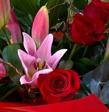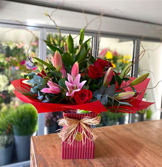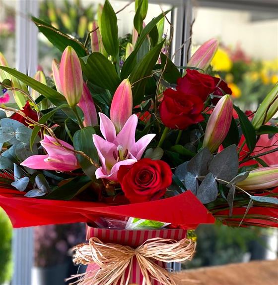 Make a lasting impression with this stunning floral arrangement, beautifully presented in a decorative gift box. Featuring a luxurious mix of fragrant pink lilies, classic red roses, and lush greenery, this bouquet is the perfect choice for any special occasion. Wrapped in elegant red accents and finished with a rustic raffia bow, it exudes charm and sophistication.