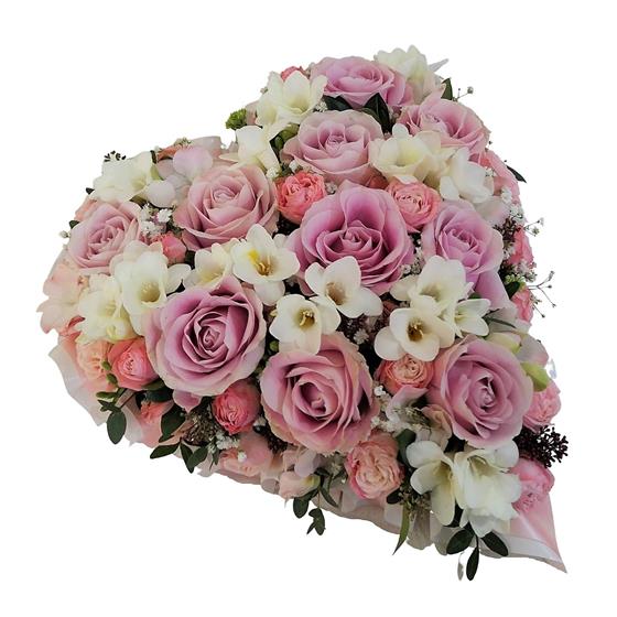A beautiful pink & white coloured heart shaped tribute with pink and white flowers finished with a ribbon edge.