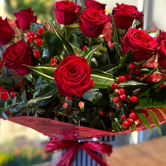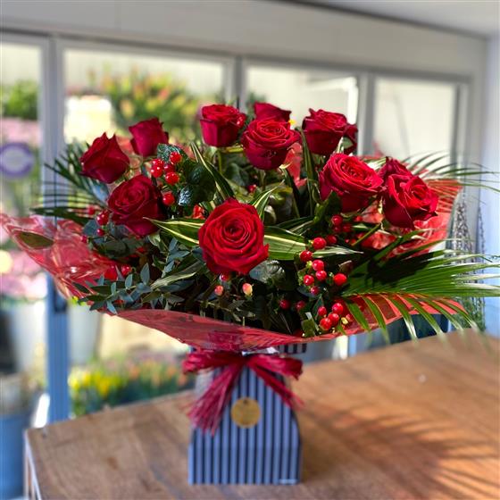 Celebrate love in full bloom with our Elegant Red Rose Arrangement. This stunning design features radiant, large headed red roses artfully arranged with vibrant red Hypericum berries and lush greenery, creating a bold and romantic statement. Presented in a chic striped gift box and finished with stylish red wrapping and a Raffia bow, this arrangement is perfect for expressing heartfelt emotions.