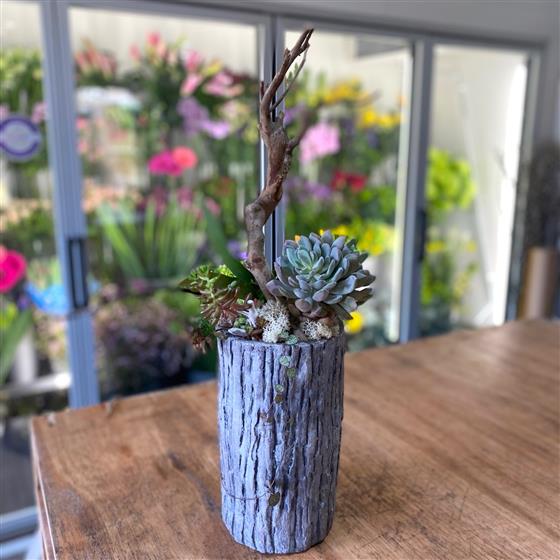A fantastic modern creation in a beautiful tall log effect ceramic container. A wonderful display of succulents, soon to flower Phalaenopsis orchids and branches