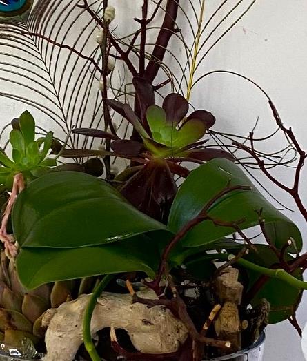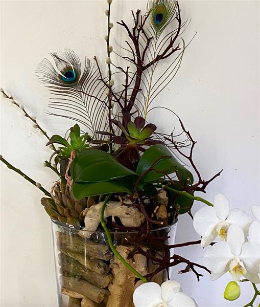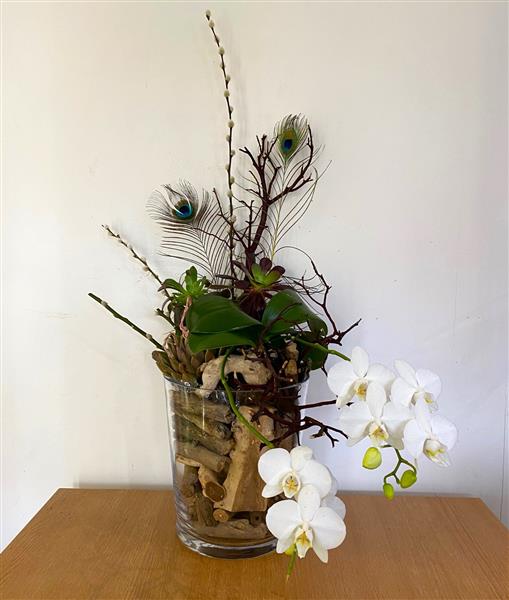A fantastic modern creation in a beautiful tall cylinder vase. A wonderful display of succulents, aeonium soon to flower Phalaenopsis orchids, logs and branches, Pussy willow and Peacock feathers. Wow- What a display!