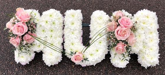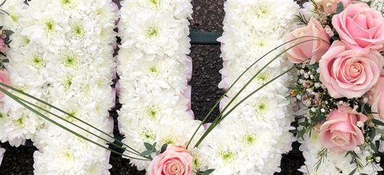 White Chrysanthemum based letters on stand with pink Rose sprays and complimentary foliage edge. Size: Height - 28cm (11") Length - 80cm (31").