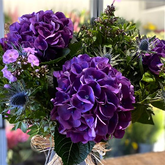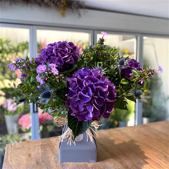 A breathtaking all-purple bouquet, showcasing large, vibrant purple Hydrangeas. Displayed in a chic floral box with no additional wrapping, this arrangement highlights the natural beauty of the flowers while being an eco-friendly design. Perfect for any occasion!