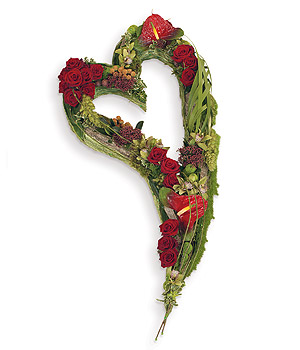 A contemporary and striking open heart shaped design, featuring Roses, exotic Orchids, Carnations and tropical foliage with a natural foliage edge and subtle use of willow and grasses. Size: Height - 87cm (34") Width - 43cm (17").