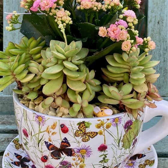 Set in an oversized ceramic teacup and saucer decorated with colorful wildflowers and butterflies, the planter is filled with lush greenery and delicate blooms. Soft pink and creamy white Kalanchoe flowers sit alongside a sculptural succulent centerpiece, creating a balanced mix of texture and color. Playful garden accents—including a tiny bird, ladybugs, and a butterfly decoration—nestle among the plants, adding personality and storybook charm.