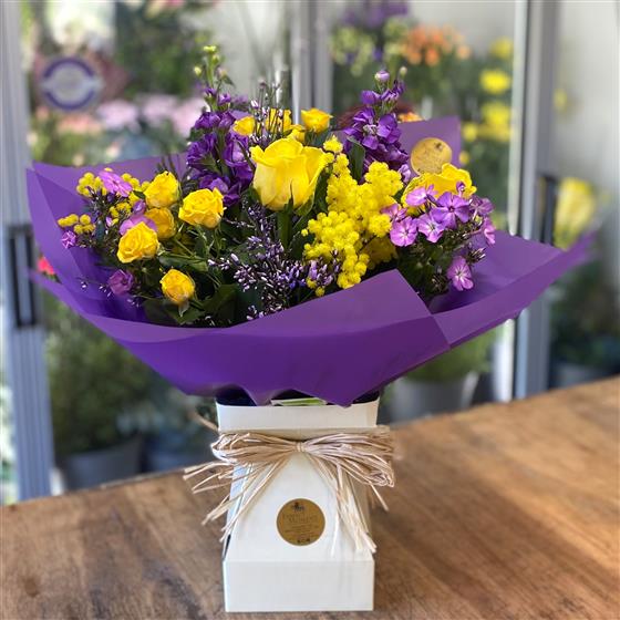A bright, cheerful handtied bouquet of yellow and purple blooms. Perfect for adding colour, warmth and joy to any occassion