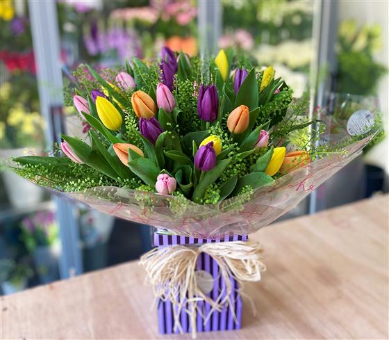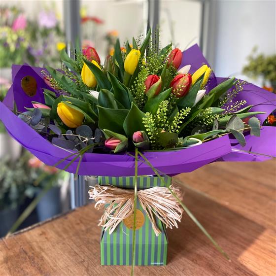 A stunning hand-tied of mixed Tulips. Simple and elegant, this arrangement will brighten somebody's day.
