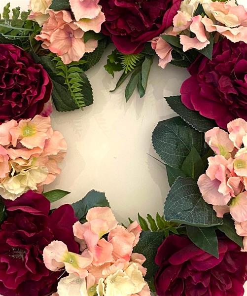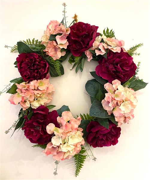 This artificial floral wreath features a beautifully arranged mix of deep burgundy and soft pink flowers, complemented by lush green leaves and ferns. The larger burgundy blooms provide a bold contrast, while the delicate pink and cream-coloured flowers add a soft, romantic touch.