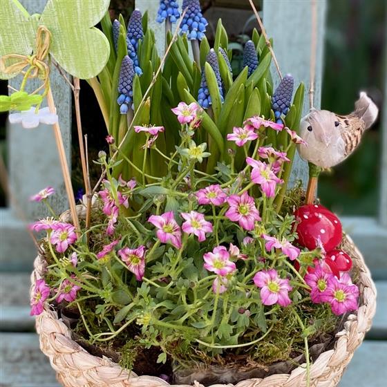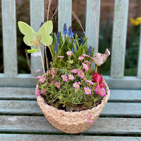 Bring the beauty of spring into your home or garden with this delightful Spring Woodland Basket Garden. Arranged in a rustic birch-style woven basket, this charming planter features vibrant blue grape hyacinths (Muscari) rising above a bed of delicate pink flowering plants, creating a fresh and colorful seasonal display.