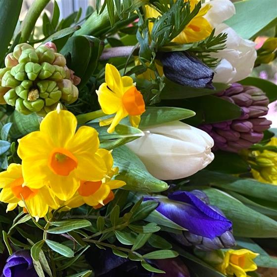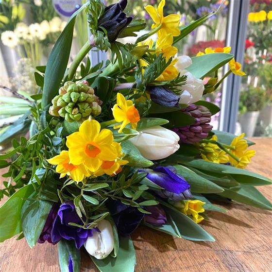 A mixed bouquet of fabulous spring flowers, handtied and Wrapped in craft paper for instant display in a vase at home.