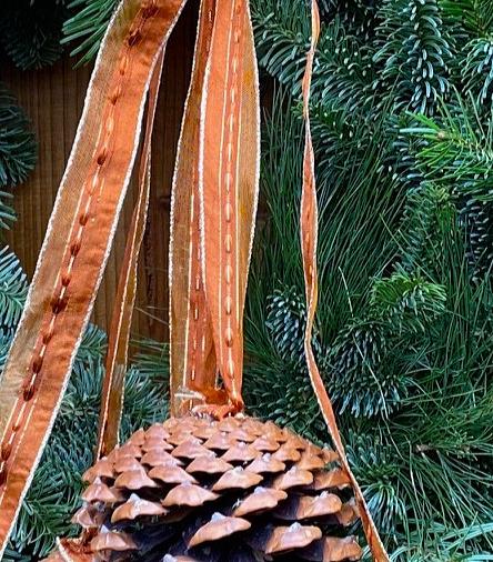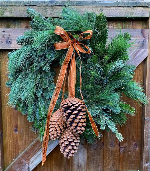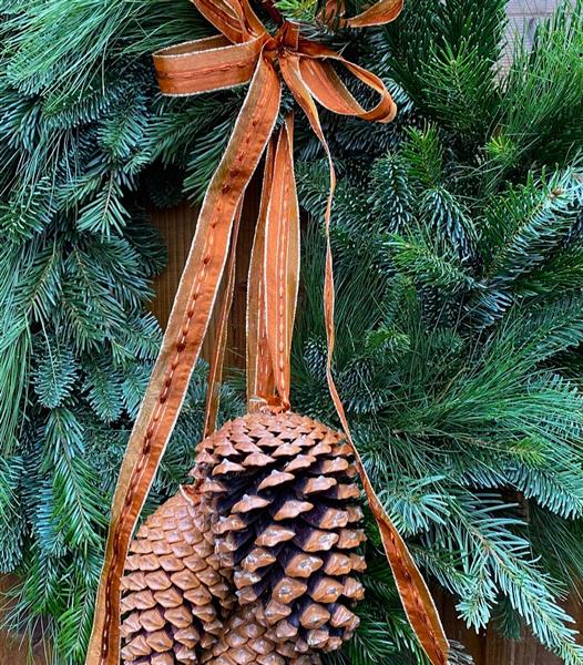 A mixed foliage wreath featuring 3 Large Cones hanging from Luxury ribbon. Simply elegant!