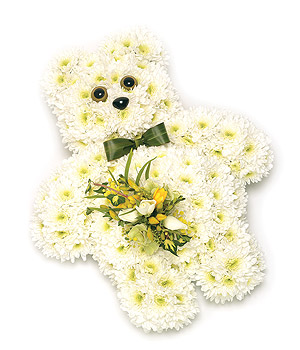White Chrysanthemum based teddy bear design with leaf 'Bow Tie' and white & Lemon spray of Freesias and spray Roses. Size: Height - 48cm (19") Width - 38cm (15").