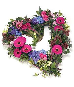 Textured open heart shape tribute in shades of pink and blue, including Roses, Gerbera, Hydrangea, Eustoma and complimentary foliage edge.