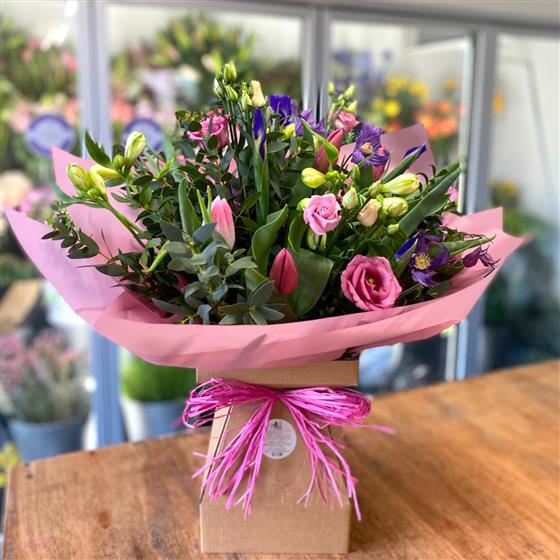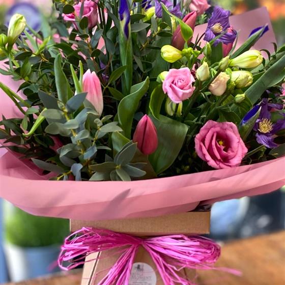 A beautiful mix of delicate pink, white and purple spring flowers and complimenting greenery.