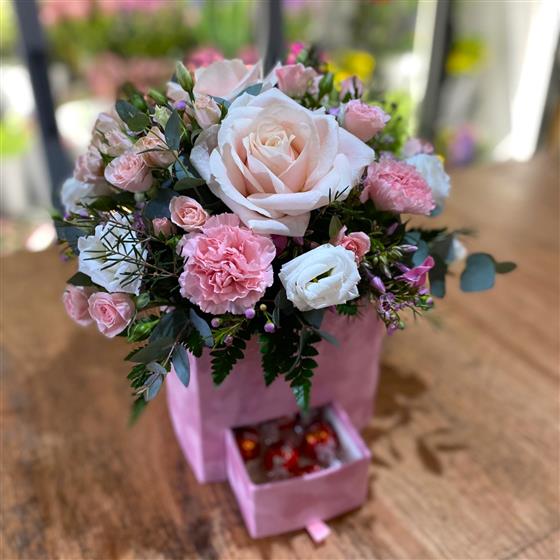 A luxury floral heart box filled with beautiful pink and cream blooms and the addition of Lindor balls in the secret drawer.