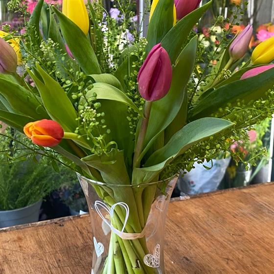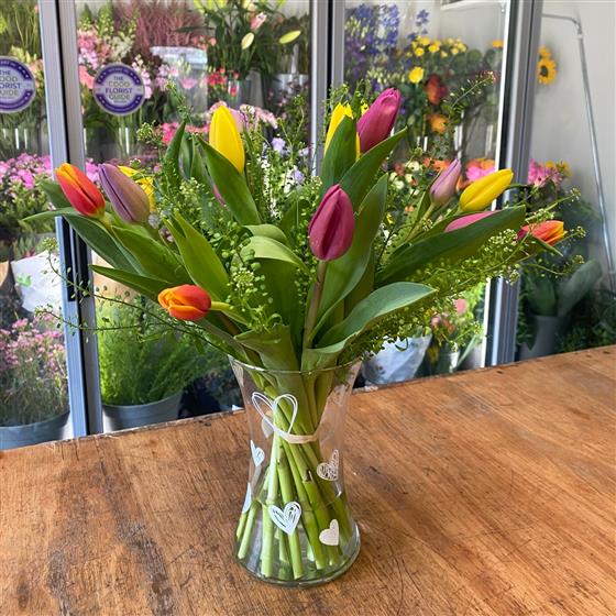 A cute vase covered in hearts filled with mixed Tulips- a simple gift for the Tulips lover.