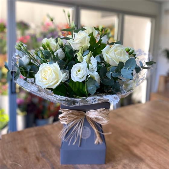 A stunning, classic white and green floral bouquet. This is an elegant flower gift that will look magnificent in any setting.