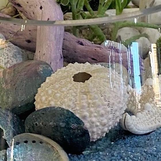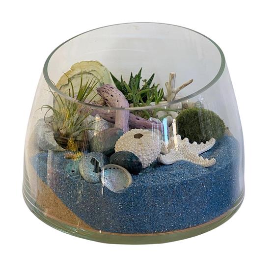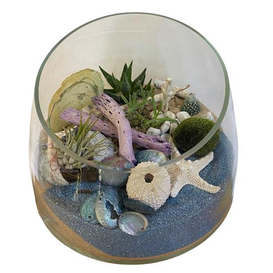 A seaside display within a glass bowl with Succulent plants, Tillandsia air plants and shells.