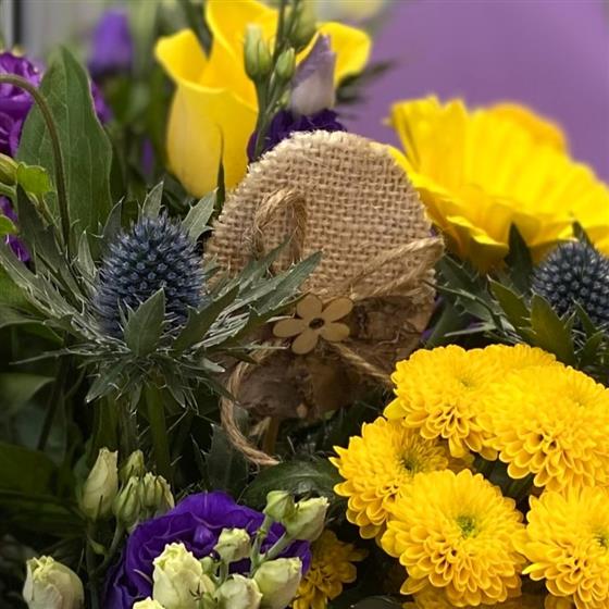 A bold and vibrant aqua-pack bouquet full of rich colour and texture. Eye catching including an Easter decoration