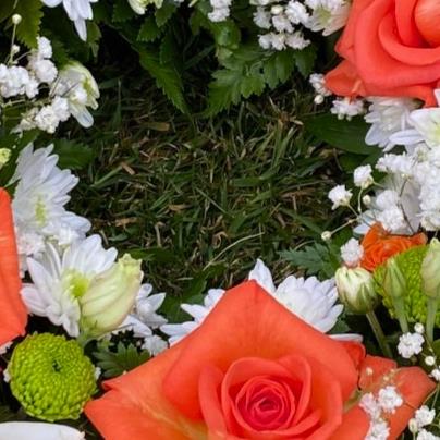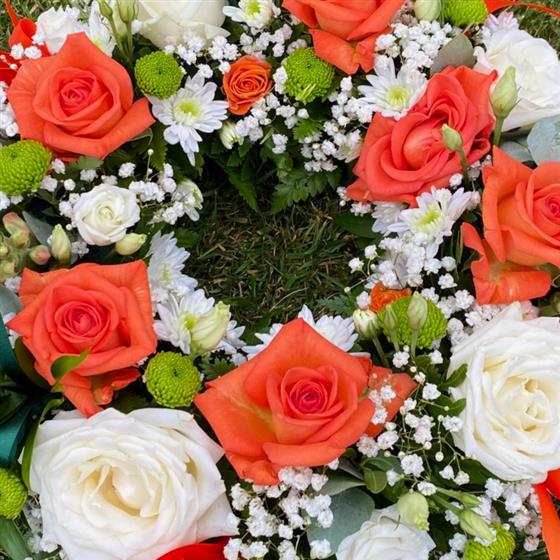 A vibrant orange, white and green wreath complimented with a mix of luscious green foliage